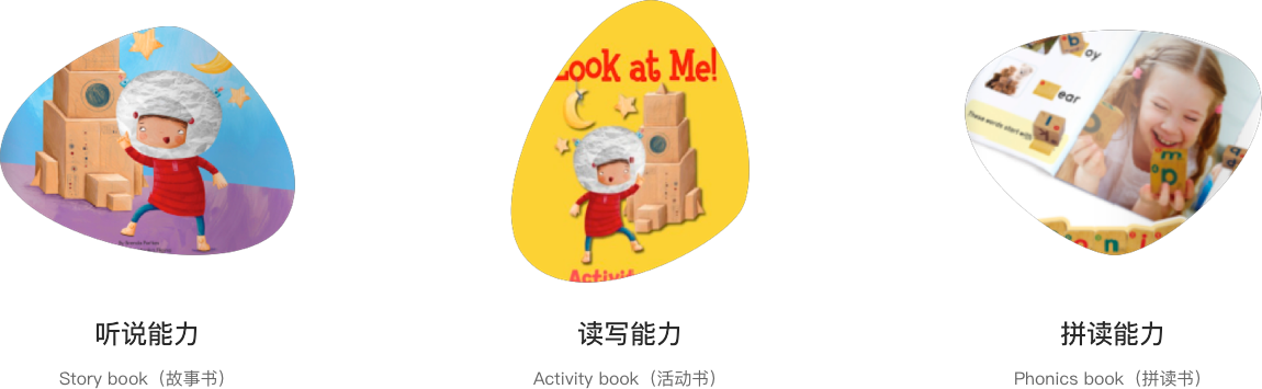 故事绘本、练习用书、自然拼读积木、线上app音视频和互动游戏等资源,让老师和家长分别在课中和课后帮助孩子便捷地学习并巩固复习。