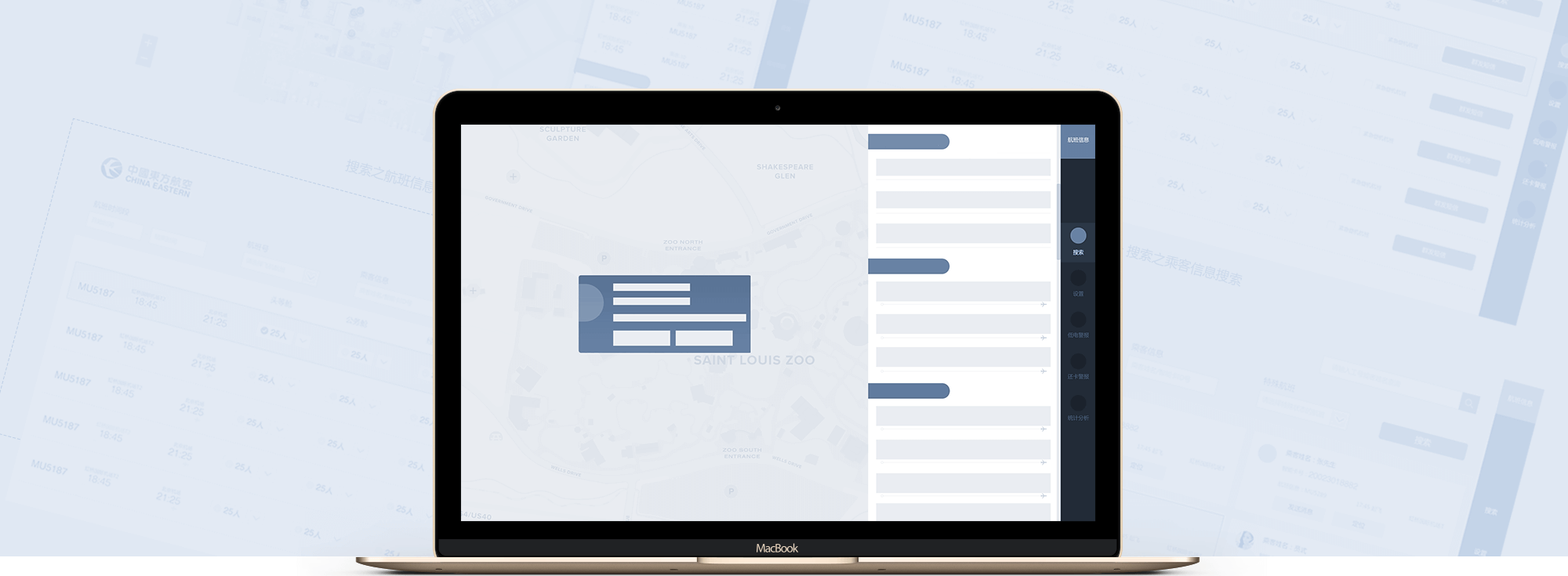 利用前期资料整理,我们将东方航空定位系统进行初步可落交互原型设计,在整个设计过程中,秉承以用户为中心的创新理念,在界面布局方面将导航放置左侧,留出更多的空间展示乘客轨迹,通过交互即可查看航班相应信息。